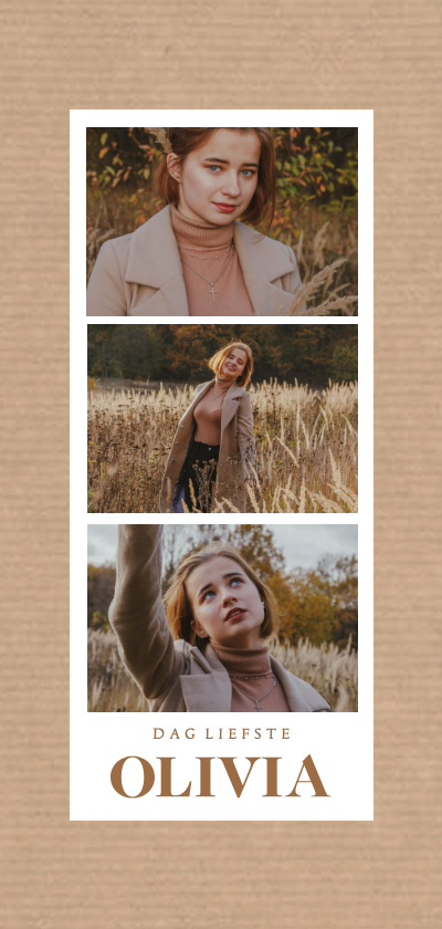 Een rouwkaart met een krafpapierlook achtergrond en drie foto's in photobooth stijl.