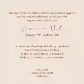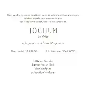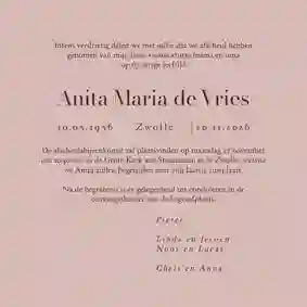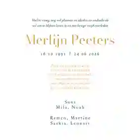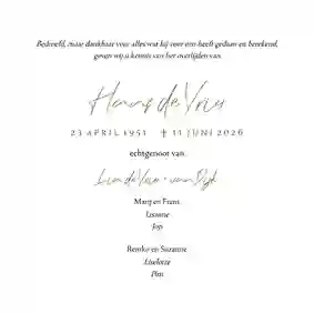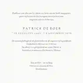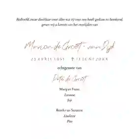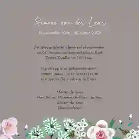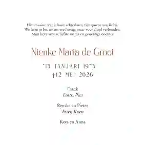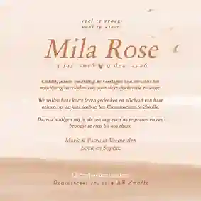 Op een deel van onze rouwkaarten met vogels is een strand of heuvelachtig landschap te zien. Iets wat je in die ontwerpen veel terugziet is de ondergaande zon: het symbool voor het einde van een situatie of een cyclus. Meestal vliegen de vogels in de richting van de zon en is alleen het silhouet te zien. Soms is er ook nog een kader voor een foto op de voorkant van de rouwkaart. Is dit niet het geval? In de kaartmaker voeg je gemakkelijk een foto met een kader toe.