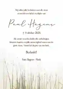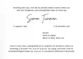 Een rouwkaart mag ook iets zeggen over het leven van je dierbare. Denk aan een passende quote, een liedregel, een gedicht, een levensmotto of een bijbeltekst. Ook een korte zin over het karakter of leven van je dierbare kan veelzeggend zijn. Je kunt zelf iets schrijven of kiezen uit inspirerende teksten in ons artikel over rouwteksten.