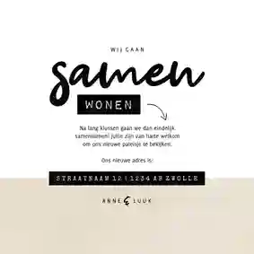 Samenwonen: wat een mooie mijlpaal. Deze bijzondere stap in jullie relatie wil je natuurlijk graag aan iedereen vertellen. En dat komt helemaal goed met een leuke samenwonen kaart. Binnen onze collectie verhuiskaarten hebben onze designers speciale samenwonen kaarten ontworpen. Van vrolijk tot grappig en van stoer tot liefdevol, deze kaartjes zijn perfect om het mooie nieuws bekend te maken. Kies de leukste samenwonen kaart en pas hem eenvoudig aan in onze kaartmaker. Zo krijgt jullie ‘wij gaan samenwonen’ aankondiging een persoonlijk tintje!