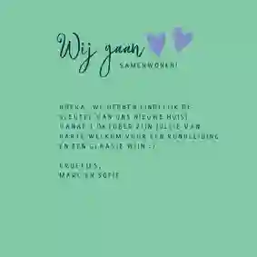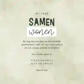 Voor het eerst bij elkaar intrekken of samen een nieuw paleisje kopen of huren: samenwonen is natuurlijk hartstikke spannend. En misschien is het kiezen van een samenwonen kaart wel de eerste echte samenwoontest. Want waar jij wellicht van kaartjes met planten of hartjes houdt, gaat je partner misschien liever voor samenwonen kaarten met sleutels of verhuisdozen. Gelukkig kun je bij ons uit heel veel ‘wij gaan samenwonen’ kaartjes kiezen. En komen jullie er samen nog steeds niet helemaal uit? Dan kun je jullie kaart heel makkelijk een eigen draai geven.