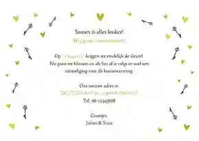 Je kunt jullie samenwonen kaart natuurlijk alleen gebruiken voor een ‘wij gaan samenwonen’ aankondiging. Maar het is ook handig om meteen jullie nieuwe adres door te geven. En je kunt het samenwonen kaartje zelfs gebruiken als uitnodiging voor het housewarming feestje. Het is dus helemaal aan jullie wat je wilt vertellen. De volgende gegevens kunnen handig zijn om op je kaart voor samenwonen te zetten.