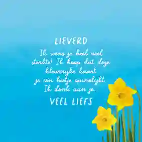 Sterkte kaarten met bloemen zijn er in alle soorten en maten. Zo hebben we kaarten met een grote bloem op de voorkant, subtiele bloemen of juist een hele bos fleurige bloemen. Er is voor iedere bloemenliefhebber wel een geschikt sterkte kaartje. De sterkte kaarten kan je zelf helemaal personaliseren in onze kaartmaker. De ontvanger krijgt daardoor een mooie persoonlijke bloemenkaart op de deurmat.