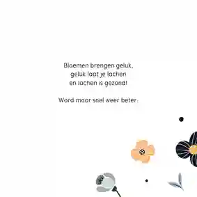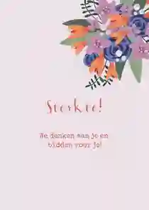 Sterkte kaarten met bloemen zijn er in alle soorten en maten. Zo hebben we kaarten met een grote bloem op de voorkant, subtiele bloemen of juist een hele bos fleurige bloemen. Er is voor iedere bloemenliefhebber wel een geschikt sterkte kaartje. De sterkte kaarten kan je zelf helemaal personaliseren in onze kaartmaker. De ontvanger krijgt daardoor een mooie persoonlijke bloemenkaart op de deurmat.
