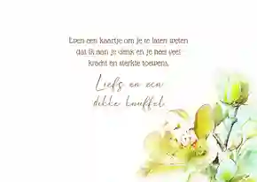 Bloemen hebben verschillende betekenissen. Zo staat de klaproos voor troost, de magnolia voor trouw en liefde, en de lavendel voor puurheid en bewondering. Zo kun je iemand op een liefdevolle manier troosten. Maar het is natuurlijk ook fijn om voor de lievelingsbloemen van de ontvanger te kiezen. Zo geef je je sterkte kaart met bloemen een persoonlijk tintje.