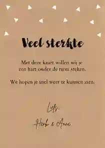 Wil je iemand sterkte wensen met een knuffel? Stuur dan een knuffel kaart over de post. Met een dikke knuffel laat je weten dat je aan iemand denkt en dat je voor hem of haar klaarstaat in een lastige periode. Kies een kaart uit onze ruime collectie “Kaartjes met sterkte of knuffel” en pas deze helemaal naar wens aan. Tevreden? Verstuur jouw sterkte kaart en geef een dierbare een dikke knuffel op afstand.