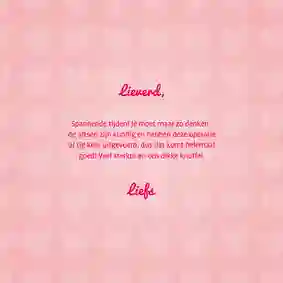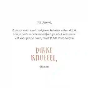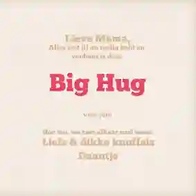 Heb je een knuffel kaart gevonden, maar heb je moeite met het vinden van de juiste woorden? Neem dan eens een kijkje bij onze sterkte teksten voor op je dikke knuffel kaart. Ook kun je tijdens het bewerken van je kaart op “vind een passende tekst” klikken voor extra inspiratie. Je kunt de tekst op de voorkant van je sterkte knuffel kaart trouwens eenvoudig aanpassen. Zo pas je “Dikke knuffel voor jou vandaag” heel eenvoudig aan naar “Dikke knuffel voor jullie”.