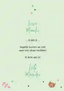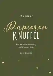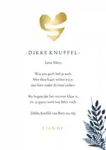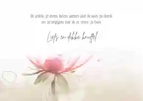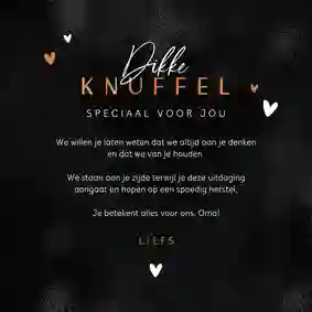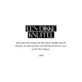 Heb je een knuffel kaart gevonden, maar heb je moeite met het vinden van de juiste woorden? Neem dan eens een kijkje bij onze sterkte teksten voor op je dikke knuffel kaart. Ook kun je tijdens het bewerken van je kaart op “vind een passende tekst” klikken voor extra inspiratie. Je kunt de tekst op de voorkant van je sterkte knuffel kaart trouwens eenvoudig aanpassen. Zo pas je “Dikke knuffel voor jou vandaag” heel eenvoudig aan naar “Dikke knuffel voor jullie”.