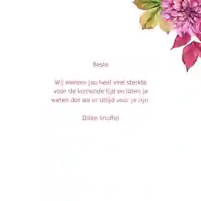 Op sommige dagen kun je een dikke knuffel goed gebruiken. Misschien ben je al een tijdje ziek, heb je een dierbare verloren of zit je gewoon niet zo lekker in je vel. De woorden “Ik denk aan je” kunnen dan ontzettend fijn zijn. Verstuur daarom een dikke knuffel via Kaartje2go. Kies een sterkte knuffel kaart uit de galerij en geef hier vervolgens je eigen draai aan in onze online kaartmaker. Voeg bijvoorbeeld een lieve foto toe of plaats een passend figuur op de kaart. Een hartje, bloem of de woorden “Dikke knuffel voor jou” zijn goede opties.