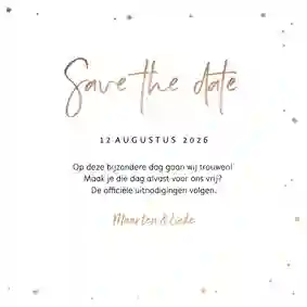 Stijlvolle kaart voor een geregistreerd partnerschap met subtiele goudlook confetti, hartjes en eigen foto.