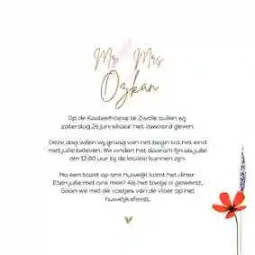 Vraag je vriendin of ze je bruidsmeisje wil zijn met deze stijlvolle kaart met kleurrijke zomerbloeiers. Ruimte voor foto's op binnenzijde.