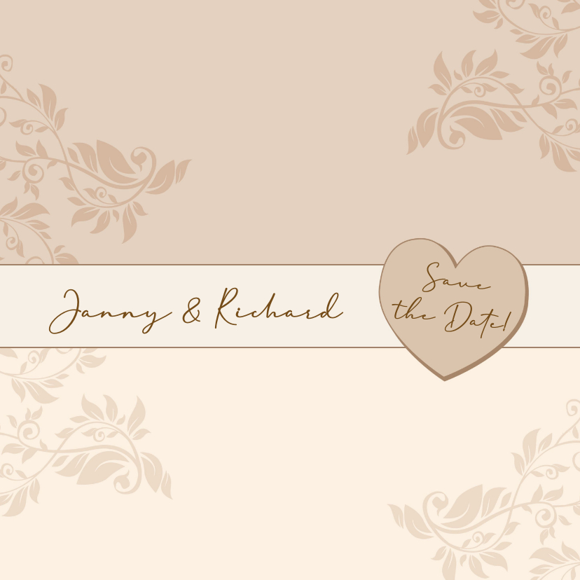 Trouwkaart band met namen en hart met tekst. Passende binnenzijde met tekstvoorstel. Teksten kan je aanpassen. Er is ook een versie als bedankkaart.