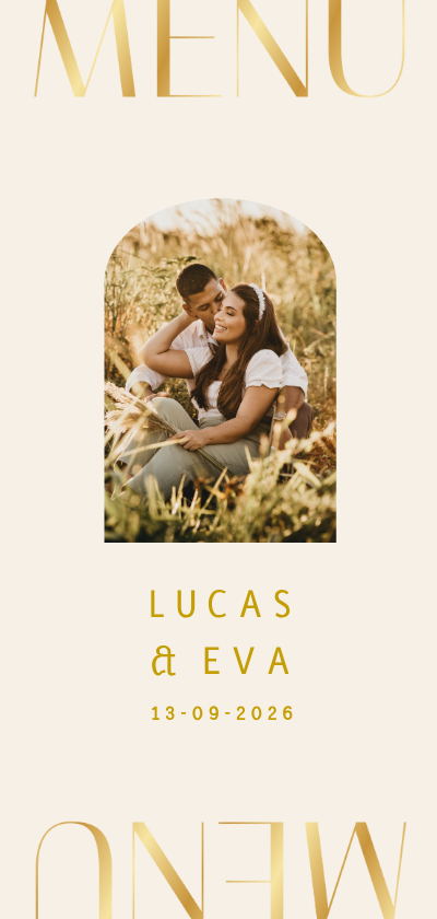 Stijlvolle menukaart met het woord "menu" in klassieke typografie en foto. Er kan gekozen worden de kaart met of zonder goudfolie te laten drukken.