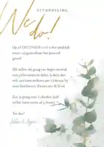 Save the date kaart om jullie dag aan te kondigen. De kaart heeft groene waterverf, eucalyptus takjes en spetters. Met en zonder goudfolie te krijgen.