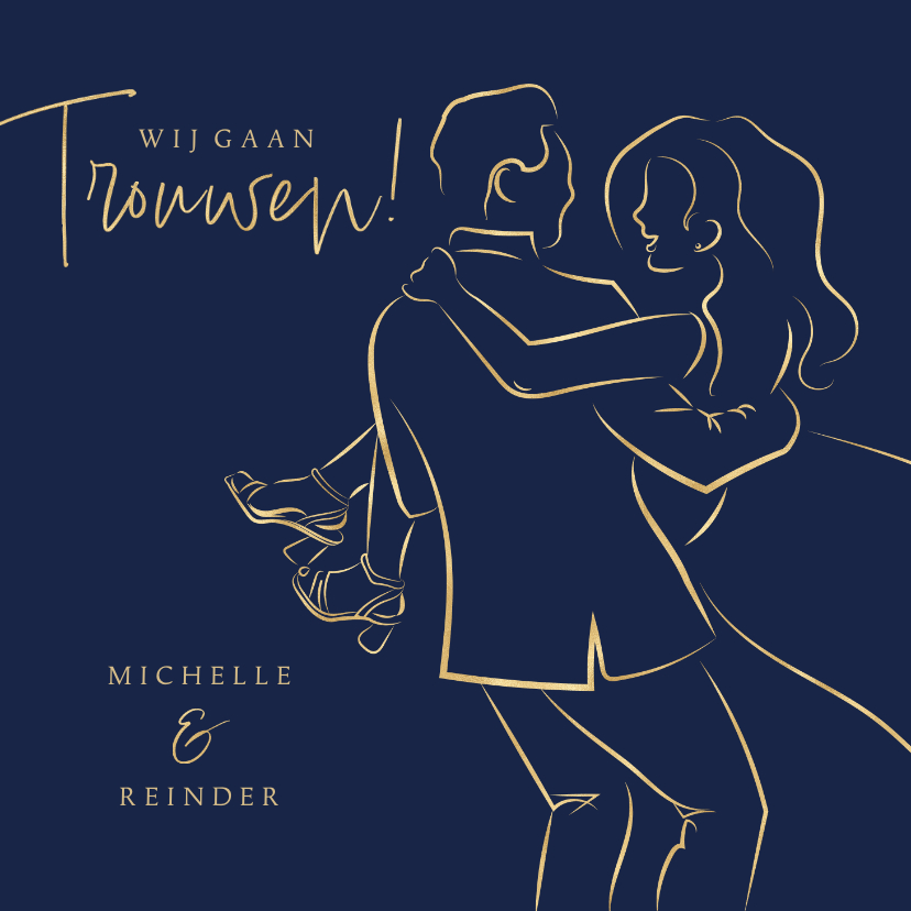 Originele trouwkaart met prachtige lijnillustratie van bruidegom met bruid in zijn armen. De achtergrondkleur is aanpasbaar!