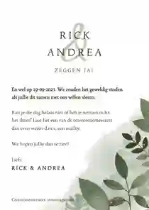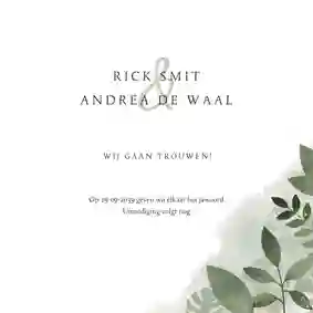 Stijlvolle trouwkaart met botanische print, waterverf en goudlook spetters (geen goudfolie). Binnenin is ruimte voor je persoonlijke uitnodiging.