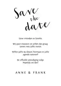 🤍 Kies één element uit die het belangrijkst is voor jullie strakke trouwkaart. Bijvoorbeeld de trouwdatum, jullie namen, een romantische foto of een zin als ‘Wij gaan trouwen’. Vervolgens gebruik je dat element als uitgangspunt van de voorkant. De rest houd je rustig of laat je weg.