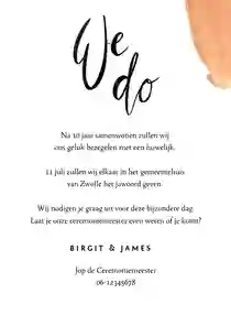 🤍 Bij eenvoudige trouwkaarten valt de boodschap extra op. Denk daarom goed na over de lettertypes die je gebruikt. Zorg ook dat je niet meer dan twee lettertypes gebruikt, bijvoorbeeld één lettertype voor kopjes en één lettertype voor de informatie. Zo houd je je trouwkaart minimalistisch en rustig.