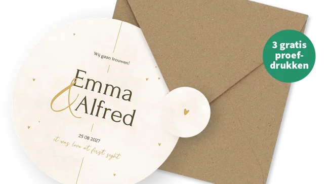 Tadaa! Je hebt de allermooiste trouwkaartjes gekozen of zelf gemaakt. Ze zien er vast geweldig uit. We raden je altijd aan om te kiezen voor een check-check-dubbelcheck met een gratis proefdruk. Zo kun je ook direct bepalen welke papiersoort en envelopkleur het beste bij jullie huwelijkskaartjes past. Vervolgens kun je vanuit je account een bestelling plaatsen, en deze aanvullen met de mooiste extra’s en accessoires voor trouwkaarten.