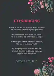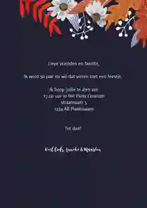 Bloemen staan er om bekend om vreugde te brengen. Dit maakt boeketten, bloemenkransen en wilde bloemen vrolijke versiering voor op een uitnodiging. In onze collectie vind je dan ook een heleboel uitnodigingen met bloemen terug. Je kunt eenvoudig filteren op de gelegenheid waarvoor jij een bloemenkaart wilt versturen. Ga bijvoorbeeld voor een housewarming uitnodiging, jubileumkaart, uitnodiging voor een pensioenfeest of een trouwkaart met bloemen. En wist je dat elke bloem een eigen betekenis heeft? Zo staan rode rozen symbool voor liefde, hortensia’s voor dankbaarheid en blauw voor onsterfelijkheid.