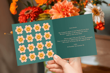 💌 Tip: Wil je er zeker van zijn dat je niets over het hoofd hebt gezien? Bestel dan een gratis proefdruk. Daarmee kun je de uitnodiging nog even in het echt bewonderen voor je de bestelling plaatst.