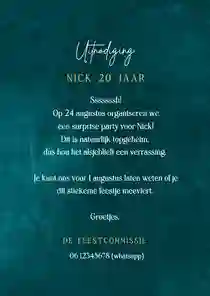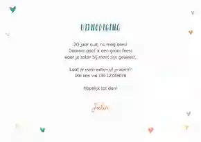 🎉 Tip: Natuurlijk kun je ook zelf een uitnodiging voor je 20e verjaardag maken. Kies hiervoor een kaartje uit de collectie “Uitnodiging 20 jaar” en klik op “Kaart bewerken”. Nu kun je de kaart personaliseren en bijvoorbeeld een foto van jezelf toevoegen.
