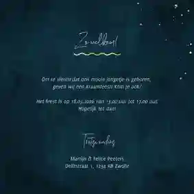 Ook zonder foto kun je de uitnodiging een persoonlijk tintje geven. Dit doe je door de kaart te personaliseren in de kaartmaker en leuke extra’s toe te voegen. Zo maak je zonder foto toch een unieke, persoonlijke uitnodiging. Kies bijvoorbeeld voor een gekleurde envelop, matchende sluitzegels of mooie adressticker.