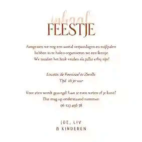 Niet alle uitnodigingen hebben een foto nodig. Veel ontwerpen zijn namelijk al leuk genoeg van zichzelf. Ook een uitnodiging zonder foto maken? Kies een ontwerp uit onze collectie en pas deze naar wens aan met onze kaartmaker.