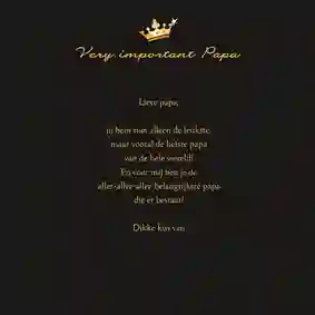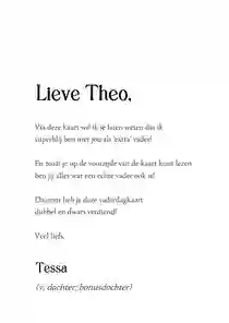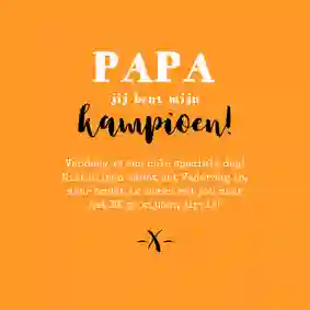 Hebben jij en je vader een inside joke die altijd terugkomt? Maak dan je eigen grappige Vaderdag kaart! Want met een zelfgeschreven tekst of hilarische foto weet je natuurlijk precies de juiste snaar te raken. Dat wordt krom liggen van het lachen! Start bijvoorbeeld met een blanco kaart en voeg komische figuren en een grappige Vaderdag tekst toe. Of kies voor een fotokaart met een hilarische foto van je vader. Oh, en huisdieren doen het ook altijd goed op een grappige Vaderdag kaart.