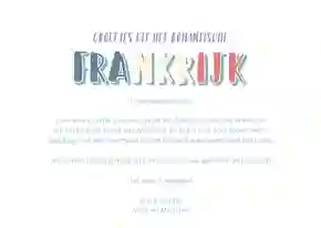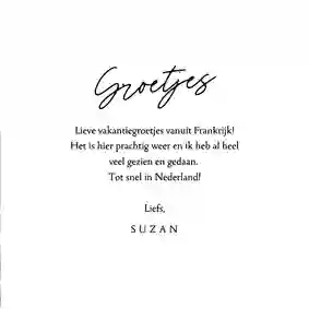 Kies een kaart uit onze hele leuke collectie Franse vakantiekaarten, maar je kunt jouw kaart ook helemaal zelf ontwerpen. Zo kun je zelf foto's toevoegen, je eigen teksten plaatsen en we hebben leuke figuren en kaders om je kaart mee te versieren. Weet je niet zo goed wat je op je vakantiekaart zal schrijven? We hebben een aantal leuke teksten voor op een vakantiekaart voor je op een rijtje gezet.