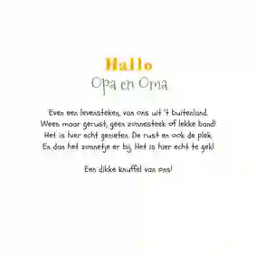 Als je je ‘groeten uit’ ansichtkaart op werkdagen voor 21:00 uur bestelt, dan doen we deze diezelfde dag nog op de post. Zo liggen jouw vakantiegroetjes lekker snel bij de ontvanger op de deurmat. Fijne vakantie nog!