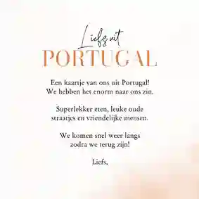 Kies een kaart uit onze hele leuke collectie Portugese vakantiekaarten, maar je kunt jouw kaart ook helemaal zelf ontwerpen. Zo kun je zelf foto's toevoegen, je eigen teksten plaatsen en we hebben leuke figuren en kaders om je kaart mee te versieren. Stuur bijvoorbeeld een kaartje met een eigen foto van je eigen kinderen die aan het spelen zijn op het strand.