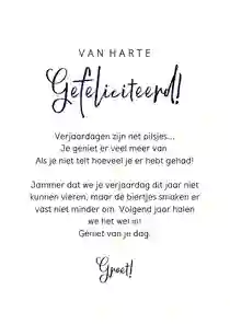 Grote kans dat jij naast je verjaardagskaart voor een 30 jarige ook op zoek bent naar een leuk cadeautje. Met zo’n mooie leeftijd pak je namelijk graag extra uit. Bij Kaartje2go vind je een heleboel leuke cadeaus. Als je een ‘gefeliciteerd 30 jaar’ kaart bestelt, kun je eenvoudig een cadeau aan je bestelling toevoegen. Zo ben je direct klaar en hoef je niet meer de stad in, ideaal toch? Ga bijvoorbeeld voor een cadeaubon, lekkere wijn of een bos bloemen.