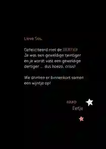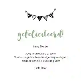 Voor je het weet laten je vrienden of familieleden de jonge jaren achter zich en staan ze aan het begin van een nieuw decennium: het volwassen leven! 30 jaar worden is een grote mijlpaal. En bij Kaartje2go maak je eenvoudig de mooiste verjaardagskaart voor de 30ste verjaardag van een vrouw of man. Hang de slingers maar vast op, trek je beste outfit aan en open de champagnefles voor het feest!