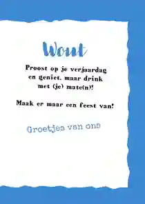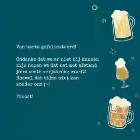 Bij Kaartje2go bestel je diverse grappige bierkaarten voor mannen. Kies bijvoorbeeld voor de 1,5 meter bier kaart, de pils op afstand kaart of de leeftijd en glazen bier moet je nooit tellen kaart. Genoeg leuke opties waardoor jouw vriend een brede glimlach op zijn gezicht tovert bij opening. Hij zal direct proosten op jullie verbondenheid.