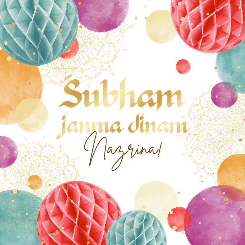 Een feestelijke Hindoestaanse verjaardagskaart met kleurrijke decoratie en goudaccenten.