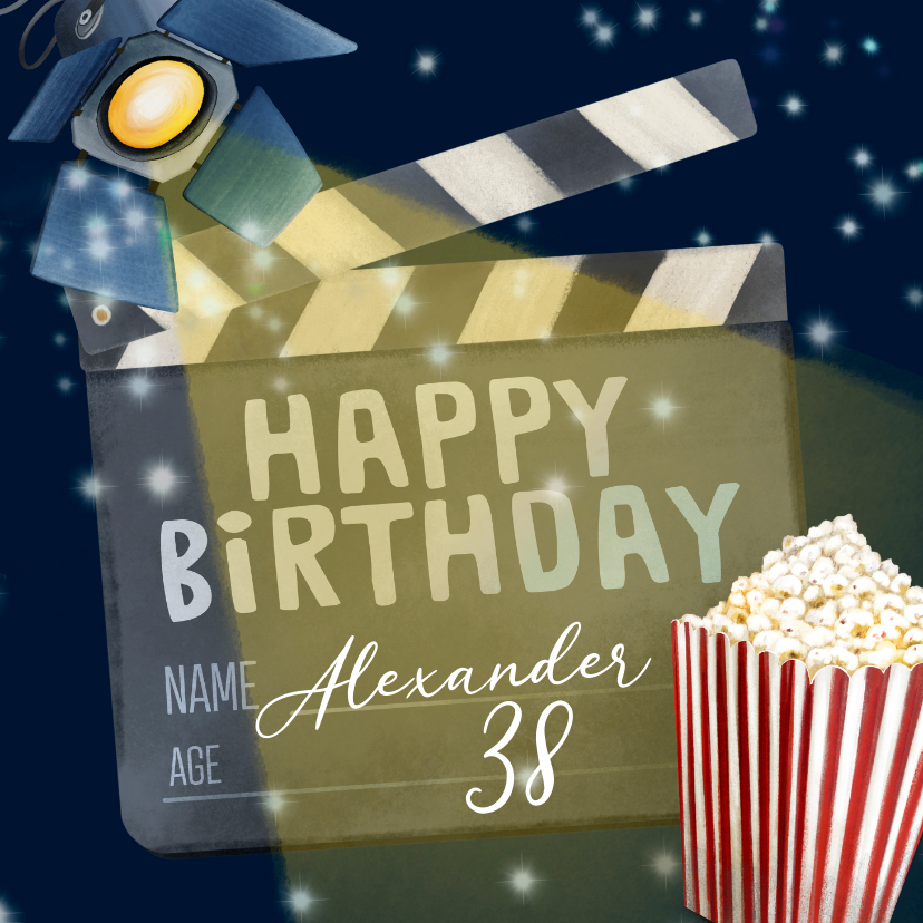 Verjaardagskaart met klapbord en popcorn en een lamp. De tekst is: happy birthday. De cursieve tekst is aanpasbaar.