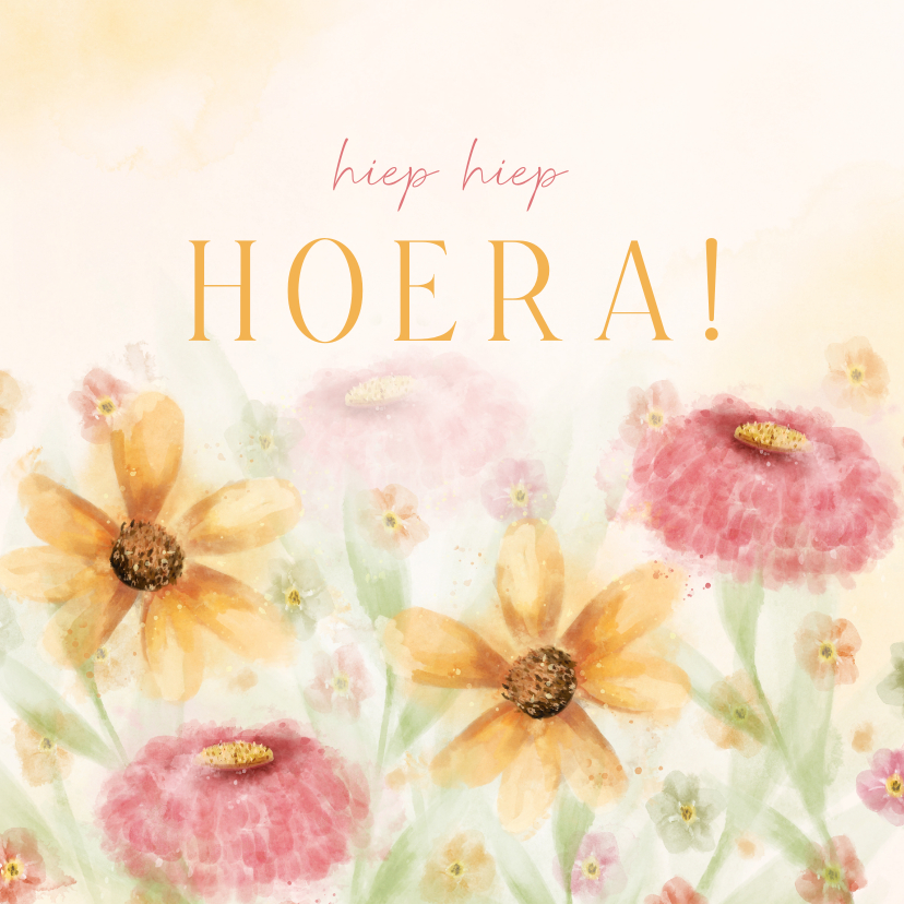 Vrolijke verjaardagskaart met verschillende, kleurrijke bloemen in waterverfstijl en een aanpasbare tekst.