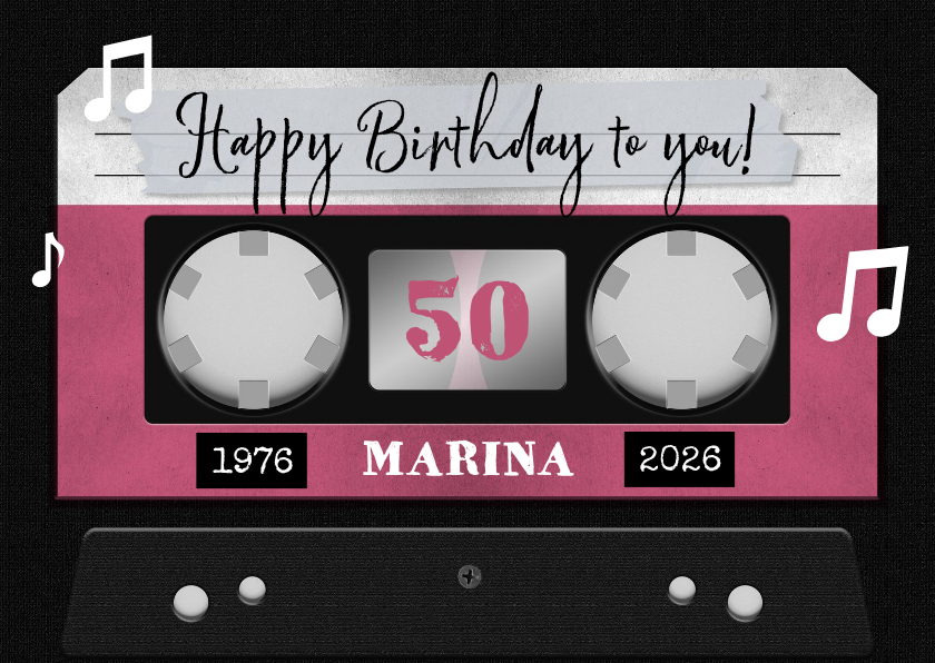 Een originele muziek verjaardagskaart in de vorm van een cassettebandje. Met muzieknoten en eigen tekst.