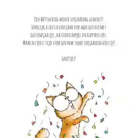 - Schrijf een persoonlijke verjaardagswens in de katten verjaardagskaart en voeg eventueel een leuk cadeau toe.