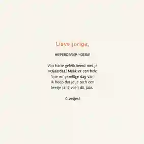 Niet gevonden wat je zocht? Kijk dan eens tussen onze verjaardagskaarten met dieren. Hier vind je de leukste kaarten met een dino, hond of paard.