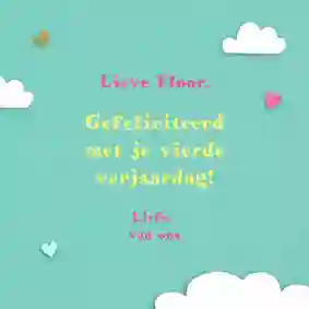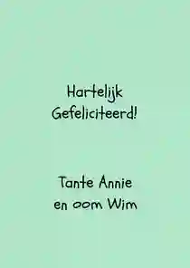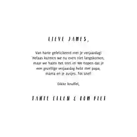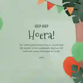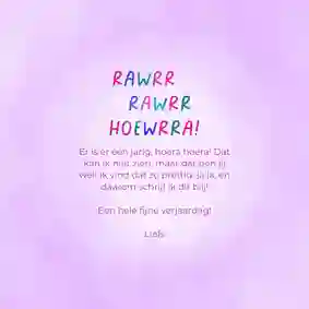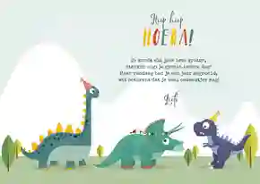 Onze designers hebben speciaal voor de leeftijdscategorie 2 tot en met 6 jaar een selectie hippe kaarten gemaakt. De collectie bestaat uit vrolijke en grappige kaarten voor zowel jongens als meisjes. Of de jarige nou 2 jaar, 3 jaar of 5 jaar wordt, door de ruime keuze aan verschillende ontwerpen, figuren en kaders en leuke verjaardagsteksten maak je heel gemakkelijk de perfecte verjaardagskaart voor de kleine jarige job of jet. Kies bijvoorbeeld voor leuke dieren zoals dino’s. Als je het kaartje voor 21:00 uur ‘s avonds besteld dan verzenden we het kaartje dezelfde dag nog. En de eerste kaart krijg je van ons cadeau!