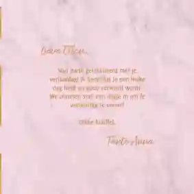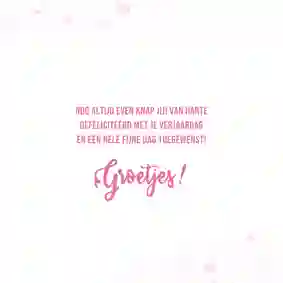 Je hebt een mooie kaart gemaakt. Nu is de kaart klaar om verzonden te worden. Bestel je voor de eerste keer een kaartje bij ons? Dan krijg je de kaart van ons cadeau. Voor de verzending heb je natuurlijk het adres van je dochter nodig. Vergeet het adres niet op te slaan in het adresboek van je account, zodat je het de volgende keer kunt selecteren. Kies een verzenddatum en wij verzorgen de rest. Wij geven de kaart aan PostNL. In 95% van de gevallen heeft je dochter de kaart de volgende dag in huis.