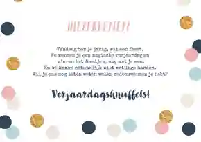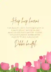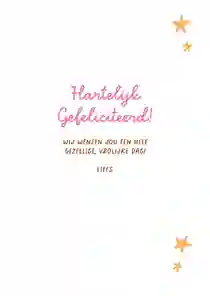 Je hebt een mooie kaart gemaakt. Nu is de kaart klaar om verzonden te worden. Bestel je voor de eerste keer een kaartje bij ons? Dan krijg je de kaart van ons cadeau. Voor de verzending heb je natuurlijk het adres van je dochter nodig. Vergeet het adres niet op te slaan in het adresboek van je account, zodat je het de volgende keer kunt selecteren. Kies een verzenddatum en wij verzorgen de rest. Wij geven de kaart aan PostNL. In 95% van de gevallen heeft je dochter de kaart de volgende dag in huis.