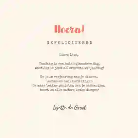 Verzend je de kaart met Kaartje2go dan is het niet alleen leuk om een kaart te krijgen, maar ook om een verjaardagskaart voor je dochter te maken. Je maakt een kaart online, voert het adres van je dochter in en wij zorgen ervoor dat de kaart in haar brievenbus terecht komt. Werkt dat echt zo simpel? Ja echt! Je begint met het kiezen van een ontwerp. We hebben veel verschillende ontwerpen. Er zit zeker wat voor jou en jouw dochter tussen. Je brengt passende ontwerpen naar voren door een stijl in het filtermenu te kiezen. Zo kun je kiezen voor een stijlvolle verjaardagskaart, klassiek of juist modern. Of past een vintage kaart beter bij deze belangrijke vrouw in je leven? Na het kiezen van een ontwerp kun je de kaart aanpassen. Dat doe je met onze kaartmaker. Je kunt het heel simpel houden door alleen een tekst op de kaart te schrijven. Een ‘gefeliciteerd met je verjaardag’ kan al genoeg zijn. Je kunt ook een langere tekst schrijven. Bijvoorbeeld een verhaaltje waarin je terugkijkt op het afgelopen jaar. Of een mooie verjaardagswens voor het jaar dat komen gaat.