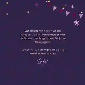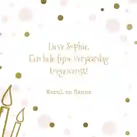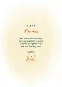Verzend je de kaart met Kaartje2go dan is het niet alleen leuk om een kaart te krijgen, maar ook om een verjaardagskaart voor je dochter te maken. Je maakt een kaart online, voert het adres van je dochter in en wij zorgen ervoor dat de kaart in haar brievenbus terecht komt. Werkt dat echt zo simpel? Ja echt! Je begint met het kiezen van een ontwerp. We hebben veel verschillende ontwerpen. Er zit zeker wat voor jou en jouw dochter tussen. Je brengt passende ontwerpen naar voren door een stijl in het filtermenu te kiezen. Zo kun je kiezen voor een stijlvolle verjaardagskaart, klassiek of juist modern. Of past een vintage kaart beter bij deze belangrijke vrouw in je leven? Na het kiezen van een ontwerp kun je de kaart aanpassen. Dat doe je met onze kaartmaker. Je kunt het heel simpel houden door alleen een tekst op de kaart te schrijven. Een ‘gefeliciteerd met je verjaardag’ kan al genoeg zijn. Je kunt ook een langere tekst schrijven. Bijvoorbeeld een verhaaltje waarin je terugkijkt op het afgelopen jaar. Of een mooie verjaardagswens voor het jaar dat komen gaat.