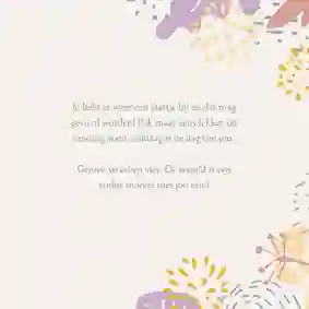 Bij Kaartje2go vind je verjaardagskaarten voor de leukste vrouwen in jouw leven. Ook voor een zus slaag je bij ons. Het selecteren van een kaart die past bij je zus is heel makkelijk dankzij ons filtermenu. Is ze bijvoorbeeld gek op kunst of muziek? Dan selecteer je dit onder ‘thema’. Of misschien ben je wel op zoek naar de meest vrolijke en feestelijke kaart. In dat geval kies je voor een thema zoals slingers & ballonnen of ‘confetti’. In het filtermenu kun je ook kiezen voor verschillende stijlen. Denk bijvoorbeeld aan klassiek of stijlvol. Of misschien past een stoere verjaardagskaart wel beter bij jouw zus. Natuurlijk kun je de verschillende filters ook met elkaar combineren. Vervolgens pas jij de kaart helemaal naar wens aan met de illustraties in de kaartmaker. Vergeet niet om er een mooie verjaardagswens op te zetten.
