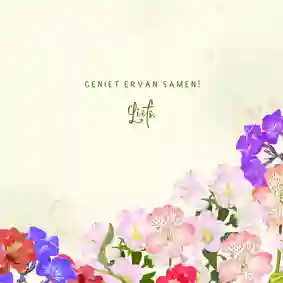 Heb je je favoriete bloemenkaart gevonden? Dan kun je hem heel makkelijk een eigen draai geven in onze handige kaartmaker. Voeg bijvoorbeeld een leuke foto toe of fleur je bloemenkaart op met mooie figuren en kaders. Wist je bijvoorbeeld dat je in onze kaartmaker uit meer dan 200 bloemenfiguren kun kiezen? En met een mooie persoonlijke tekst wordt je wenskaart nog leuker. Zo maak je eenvoudig en snel een bloemen kaart die perfect past bij je beste vriendin, opa of buurvrouw.