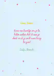 Wil je graag toch iets meer erop zetten? Kies dan voor woorden die passen bij wie je bent. Vertel bijvoorbeeld wat het met je doet dat je hem/haar verdriet ziet hebben. En als je zomaar een kaartje stuurt, vertel dan bijvoorbeeld een leuke anekdote of een verhaal wat je laatst hebt meegemaakt. Stuur je een denken aan kaart omdat je iemand succes wilt wensen? Schrijf dan bijvoorbeeld in de kaart “Ik denk aan je omdat je morgen een examen moet doen, weet dat ik altijd in je heb geloofd. Als iemand het kan, dan ben jij het.”