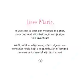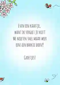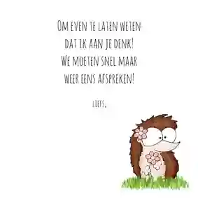 Woorden zijn vaak mooi in hun eenvoud. Het belangrijkste is dat ze uit een oprecht hart komen. Je kunt natuurlijk altijd de reden noemen dat je het kaartje stuurt. Bijvoorbeeld: “Ik denk aan je vanwege je ziekenhuisopname” of “Ik denk aan je in deze moeilijke tijd”. Veel meer hoeft het niet te zijn, de kaart zelf is al een prachtig gebaar.